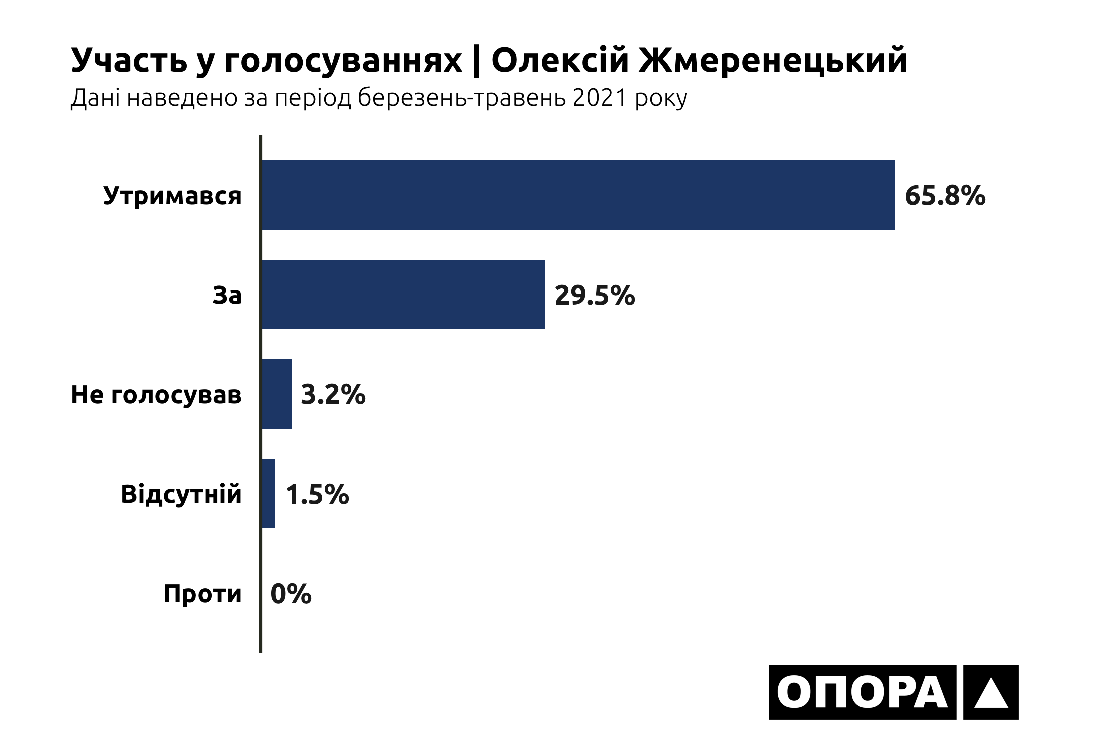 Закономірно, що загалом частіше підтримували ініціативи, запропоновані до голосування, парламентарі-мажоритарники, які належать до пропрезидентської фракції. У них кількість голосувань «за» коливається в межах 20-30%: найбільше у Олексія Жмеренецького (29,5%) та Миколи Стефанчука (27,4%), дещо менше в Ігоря Марчука та Олени Копанчук (по 21,7%).
