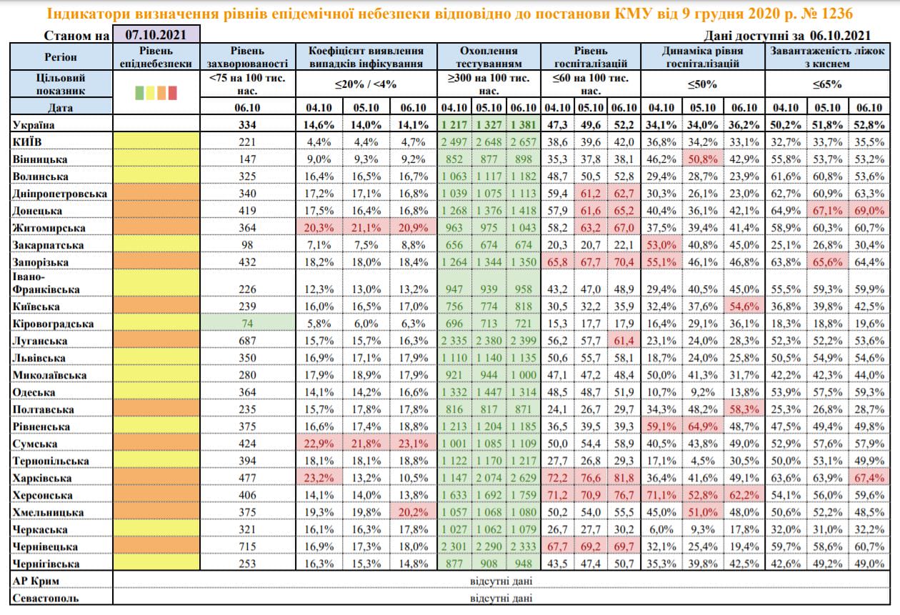 Станом на ранок 12 жовтня до "помаранчевої" зони епідемічної небезпеки віднесено 15 регіонів України.