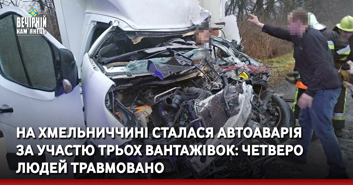 На Хмельниччині в автопригоді за участю трьох вантажівок травмувалося четверо людей. Дорожньо-транспортна пригода сталася вчора, 16 грудня, близько 16.25 години на трасі "Житомир — Чернівці" поблизу села Солобківці.