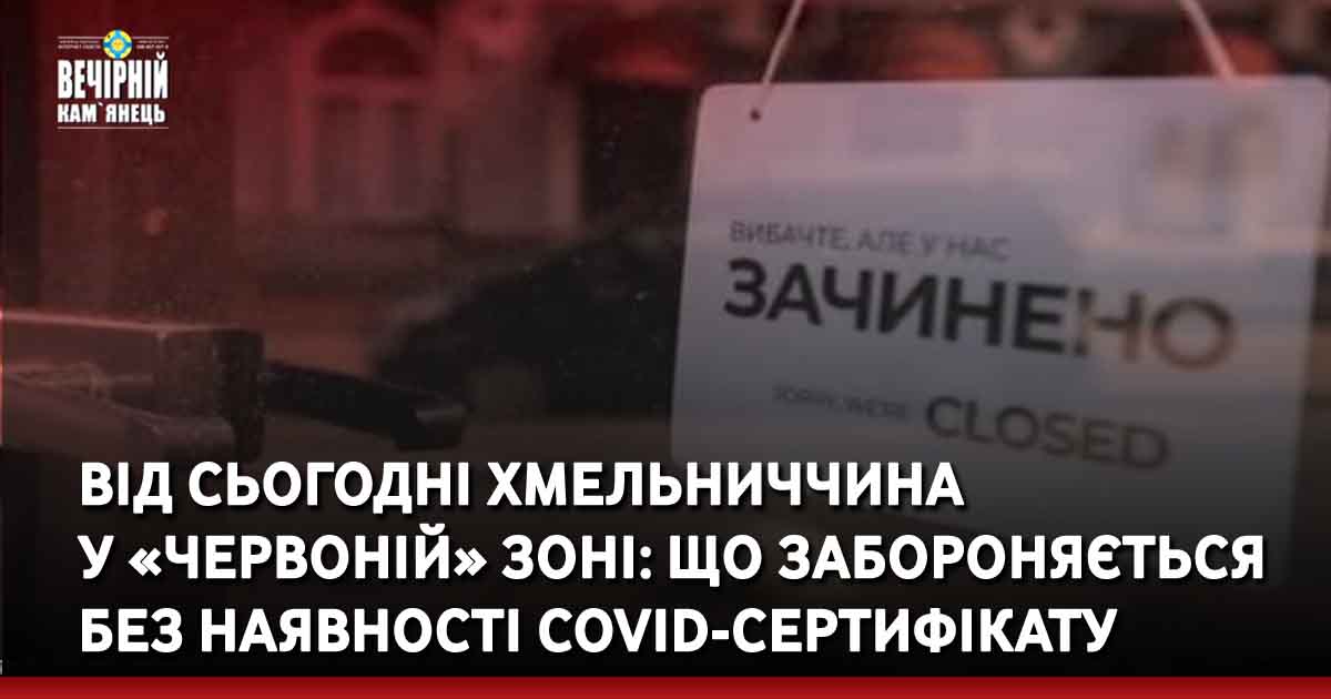 Сьогодні, 11 лютого, Хмельницька область переходить у «червону» зону епідемічної небезпеки. Від сьогодні посилюються карантинні обмеження. Але більшість обмежень не поширюються на людей, які мають COVID-19-сертифікати чи негативні тести.