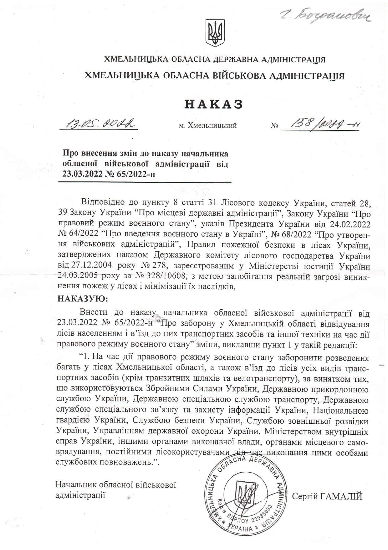 Як повідомляють у департаменті природних ресурсів та екології Хмельницької ОВА, відповідний наказ голова ОВА Сергій Гамалій підписав ще 13 травня. У документі йдеться, що цивільні мають право заходити на територію лісових масивів, але лише пішки чи на велосипедах.