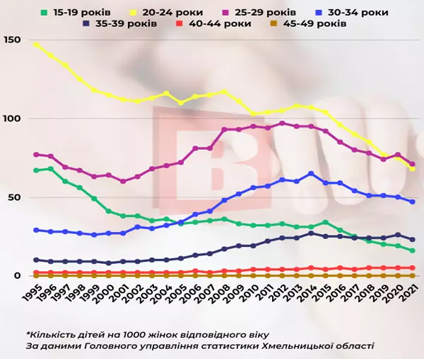 За 1995-2021 роки, відповідно до даних Головного управління статистики в Хмельницькій області, у 1995 році найчастіше народжували у віці 20-24 роки. Станом на 2021 рік показник зріс до 25-29-річного віку жінкиДетальніше з даними знайомтеся в інфографіці.