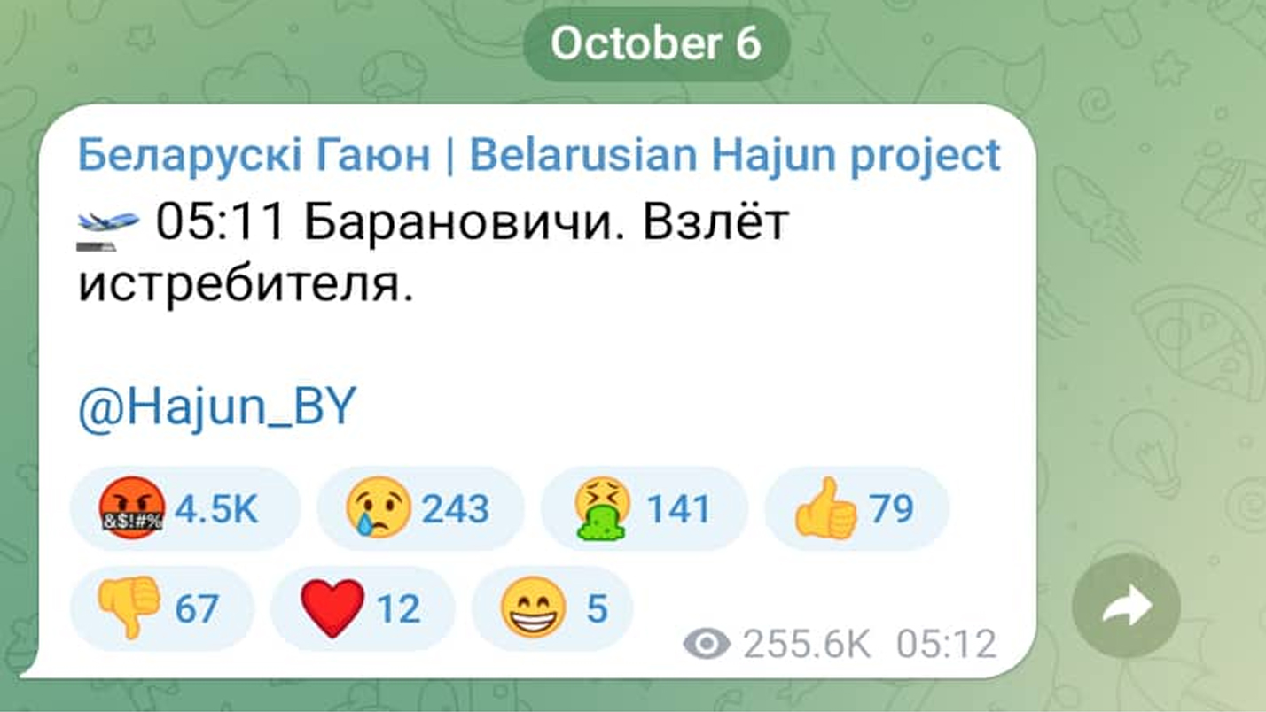 Білоруський телеграм-канал Беларускі-Гаюн зранку 6 жовтня о 5:11 опублікував повідомлення про виліт винищувача з території Білорусі, близько 6 години ранку відбувся удар по території Хмельницької області.