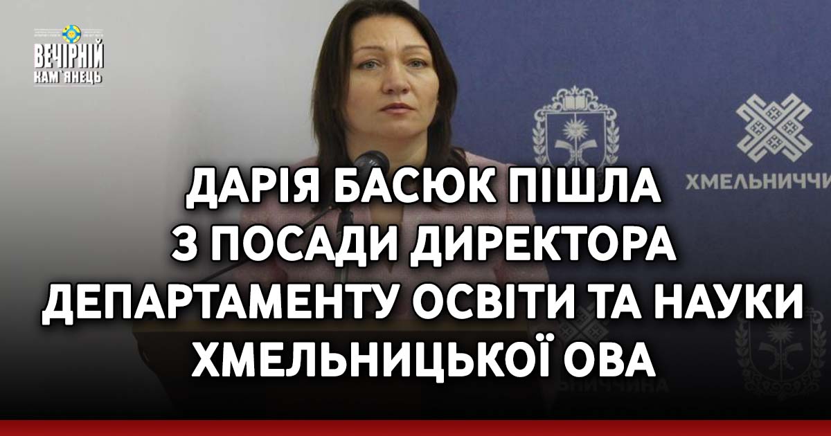 Дарія Басюк звільнилася з посади директора департаменту освіти та науки Хмельницької обласної військової адміністрації на підставі її заяви.
