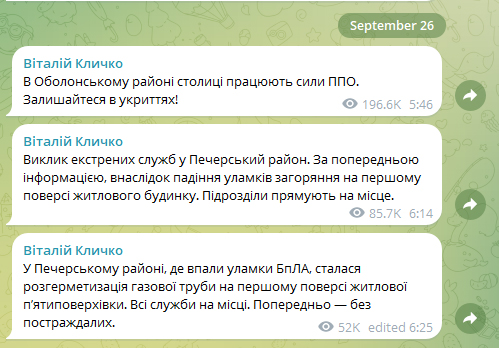 Вранці 26 вересня у Печерському районі Києва внаслідок падіння уламків російського "Шахеда" виникло загоряння на першому поверсі житлового будинку.
