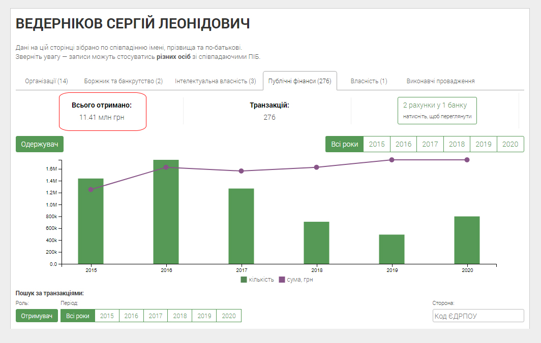 Публічні фінанси ФОП Відерніков Сергій Леонідович / Джерело: "Clarity Project"