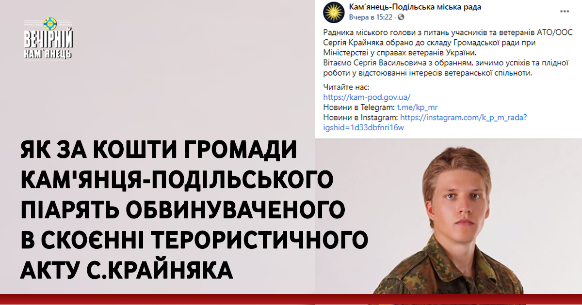 На офіційній сторінці в Фейсбук Кам'янець-Подільської міської ради піарять особу С.Крайняка, який, як відомо, є обвинуваченим в скоєні терористичного акту, щопризвів до загибелі 4 нацгвардійців та поранення 151 особи 31 серпня 2015 року.