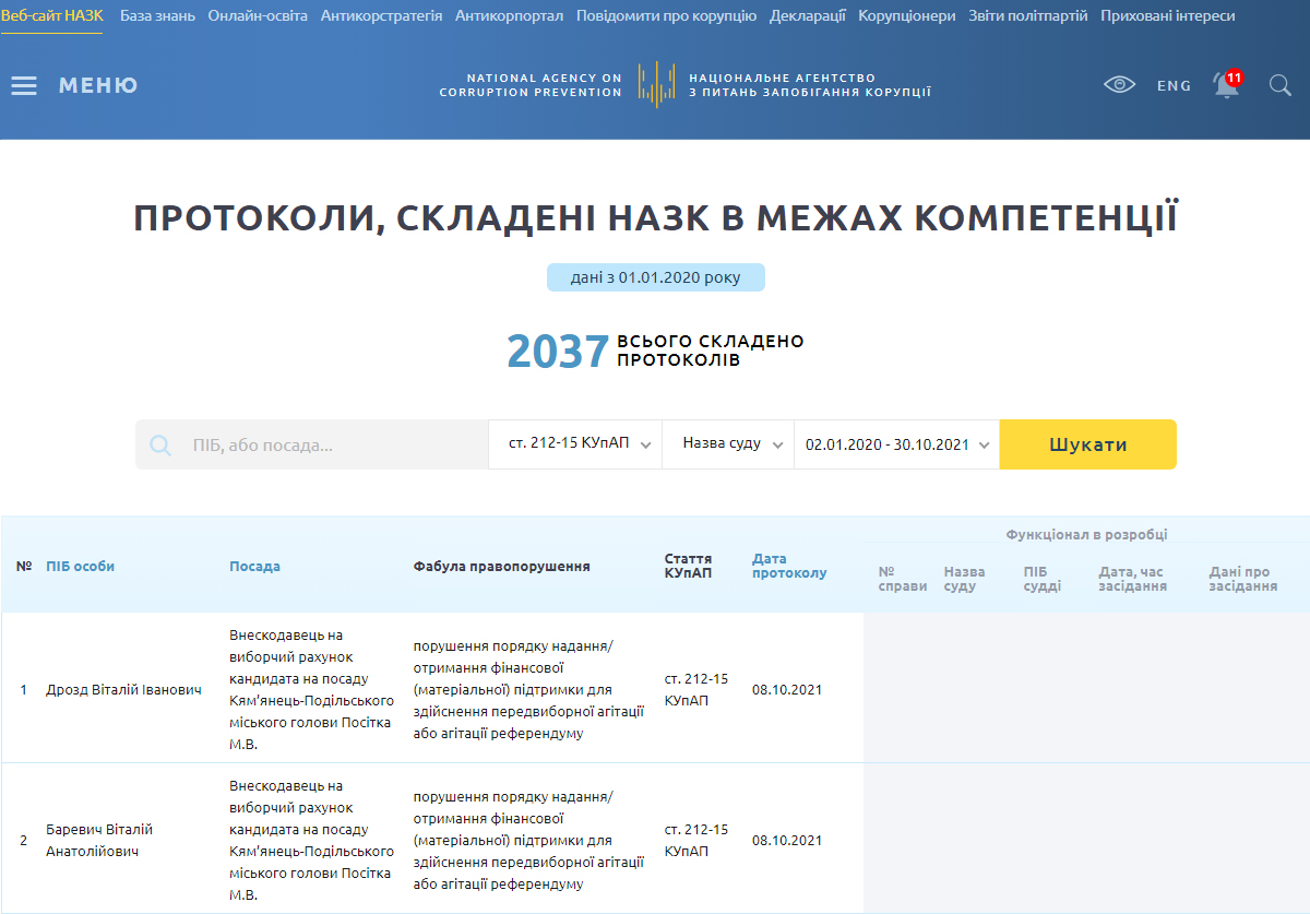 Окрім цього, НАЗК також завершило складання протоколів про адміністративне правопорушення за ст. 212-15 КУпАП стосовно фінансових спонсорів М.Посітко під час місцевих виборів 2020 року. А саме: