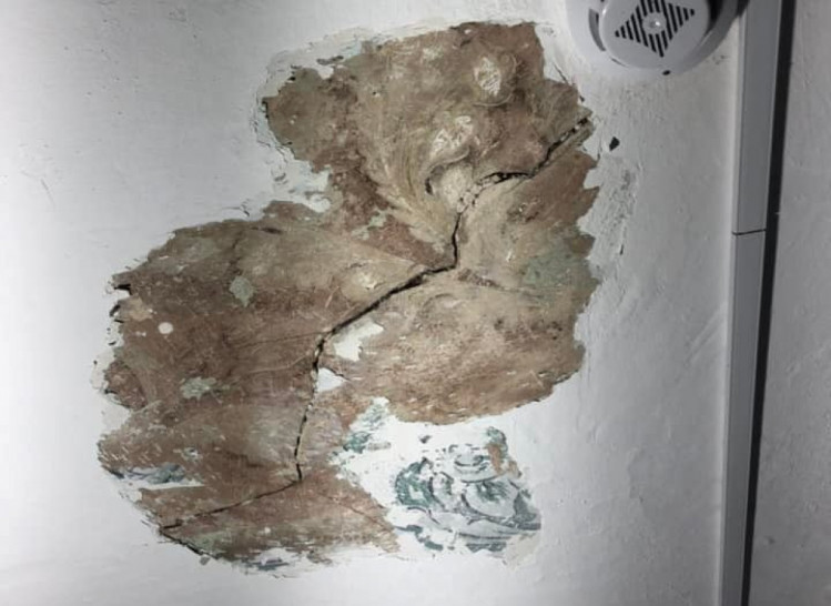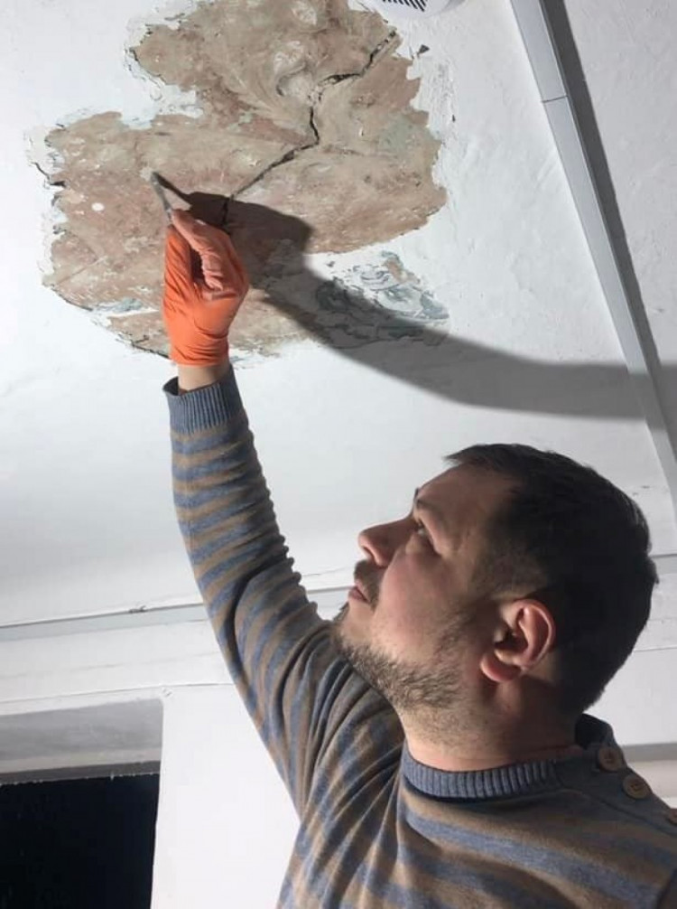 "На другому поверсі холу на стелі почала відпадати побілка. Коли Олександр розчистив невеличку ділянку, там з’явився гарно збережений розпис, на якому одразу помітні натуральні фарби і дуже високий мистецький рівень. Він точно відповідає опису палацу, який ми маємо станом на 1914 рік, де написано, що в холі стеля розписана імітацією ліпнини", - розповідає Донець.