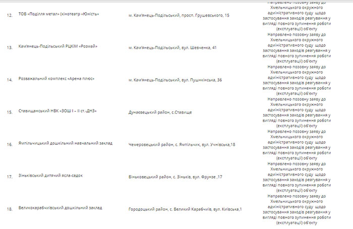 За результатами перевірок підготовлено та направлено до адміністративного суду 18 позовних заяв про повне або часткове зупинення експлуатації будівель, споруд та приміщень.