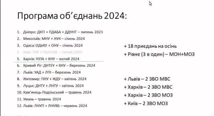 Зокрема, вже у 2024 році можуть об'єднати виші у Дніпрі, Миколаєві, Одесі, Харкові, Кривому Розі, Львові, Житомирі, Луцьку, Кам'янці-Подільському, Рівному та Умані. Докладніше - на слайді.