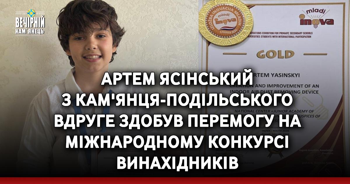 Школяр із Кам'янця-Подільського Артем Ясінський, який створив вдосконалений прилад для очистки повітря в приміщеннях, продовжує здобувати перемоги на міжнародних винахідницьких конкурсах. Цього разу він повернувся додому із перемогою на конкурсі-виставці молодіжних інновацій у Хорватії. Про це повідомили в Управлінні освіти і науки Кам'янець-Подільської міської ради.