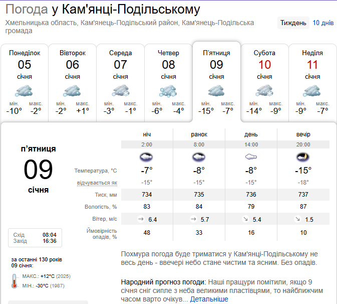 На Кам’янеччині синоптики прогнозують до – 15 градусів морозу вже у п’ятницю, 9 січня.