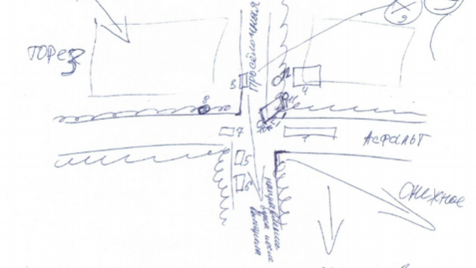 План району, звідки, ймовірно, був здійснений запуск ракети, намальований одним зі свідків у справі MH17