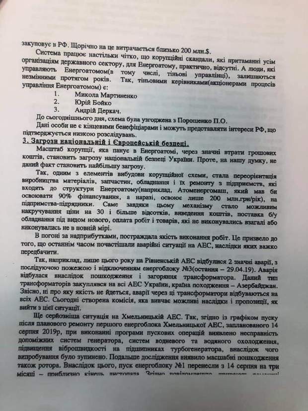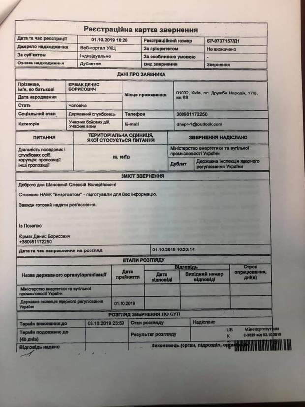 У своєму зверненні брат голови ОПУ представляється просто учасником війни і пише про корупційні схеми в "Енергоатомі". Для їх усунення він пропонує призначити Володимира Купчака.