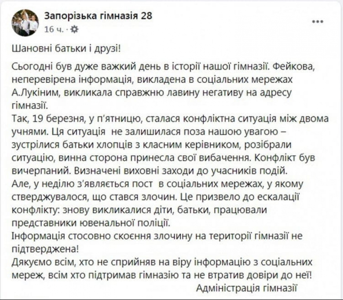 У самій гімназії №28 заявили, що у школі просто сталася конфліктна ситуація, а повідомлення про злочин — це фейк.