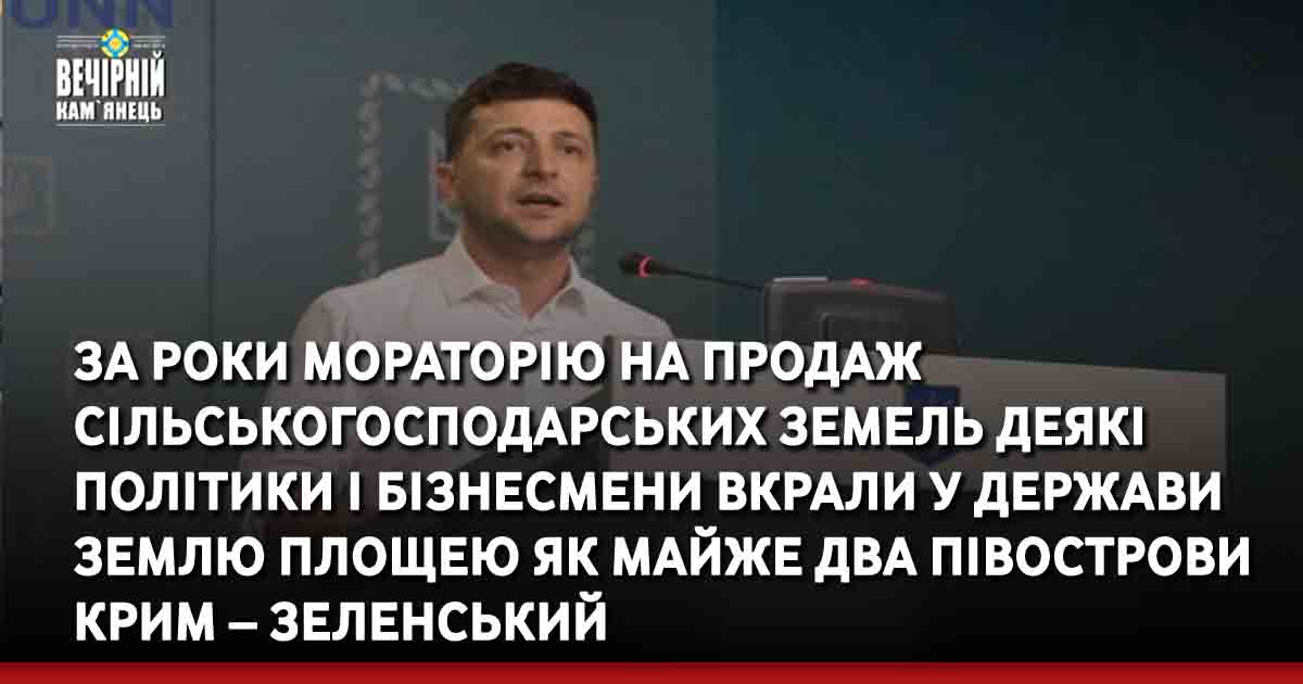 “За попередніми підрахунками, було незаконно присвоєно близько 5 млн га державних земель України. Поясню масштаб цієї цифри на дуже простому прикладі. У 2014 році Росія анексувала у нашої держави півострів Крим. За роки мораторію деякі політики і бізнесмени вкрали у держави землю, яка дорівнює площею майже двох півостровів Крим”, — заявив Зеленський.