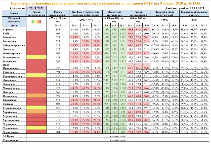 Станом на 26 листопада у “жовтій” зоні чотири області України: Закарпатська, Кіровоградська, Тернопільська та Чернівецька.