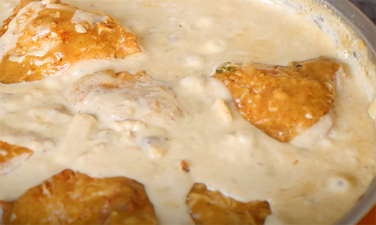 Знову прибираємо птицю та вливаємо на сковороду 160 мілілітрів вершків. Через 5 хвилин знову кладемо в соус курку та готуємо на повільному вогні близько 7 хвилин.