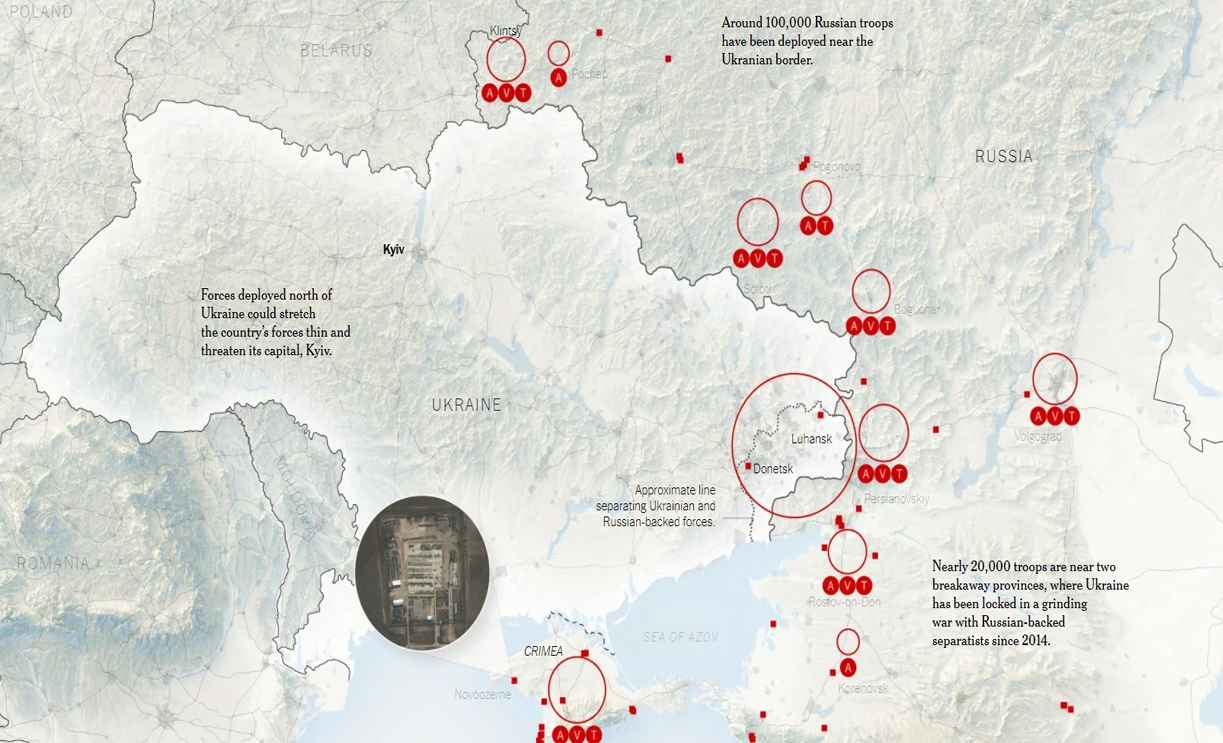 На загальній карті, оприлюдненій NYT, видно актуальну дислокацію російських підрозділів. Окремо зазначається, що на сході України, у районі, контрольованому «Л/ДНР», сконцентровано 20 тис. військ, а угруповання сил на півночі «загрожує Києву» і може бути націлене на розтягування сил української оборони.