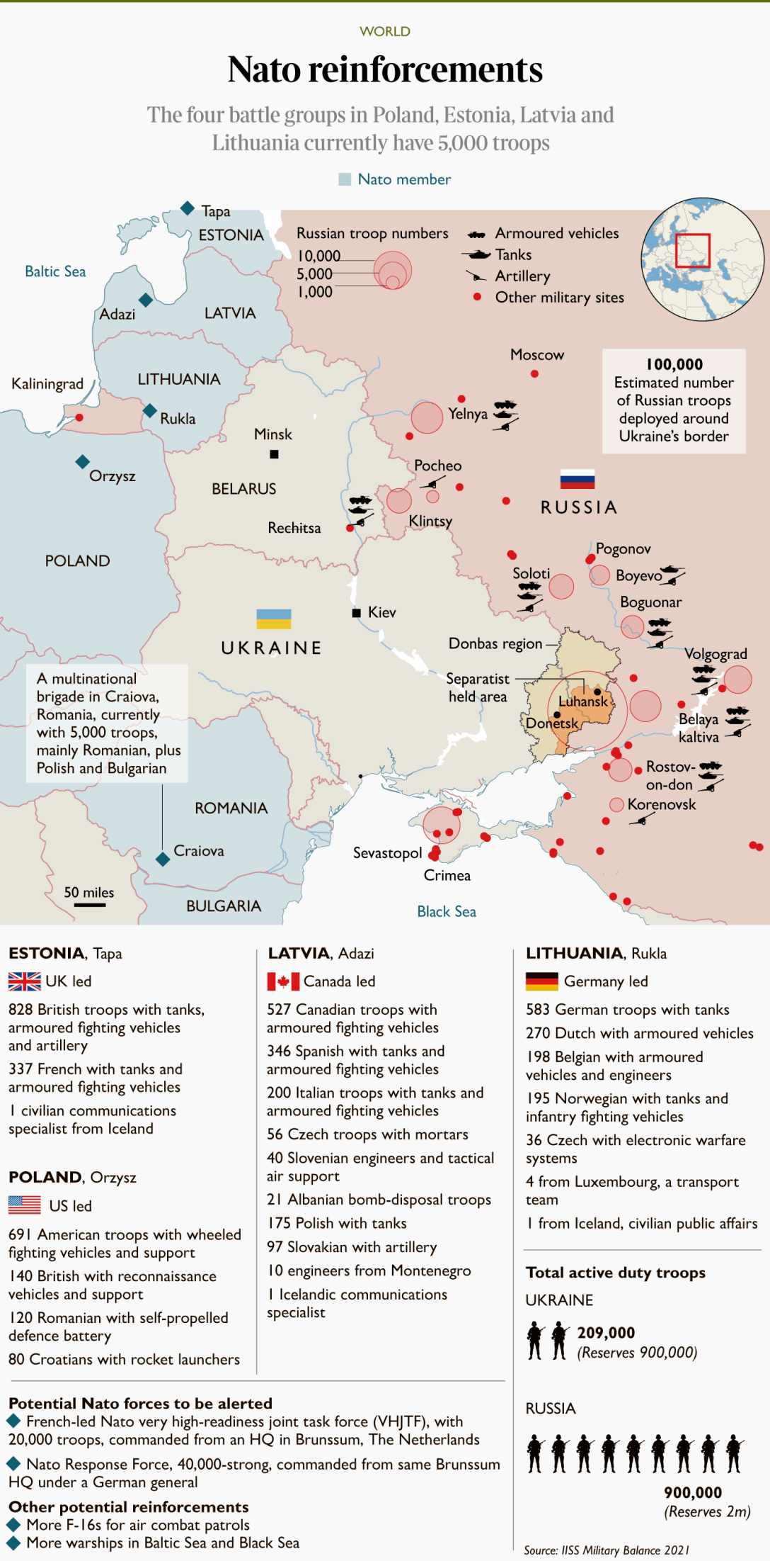 Зосередження військ РФ біля українських кордонів та на окупованих територіях. Також вказані сили НАТО у Європі