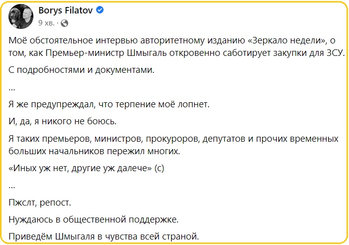 …Прем'єр-міністр Шмигаль відверто саботує закупівлі для ЗСУ… Я ж попереджав, що терпець мій лусне. І так, я нікого не боюся. Я таких прем'єрів, міністрів, прокурорів, депутатів та інших великих тимчасових начальників пережив багатьох… Приведемо Шмигаля до тями всією країною, — написав Філатов у Фейсбук.