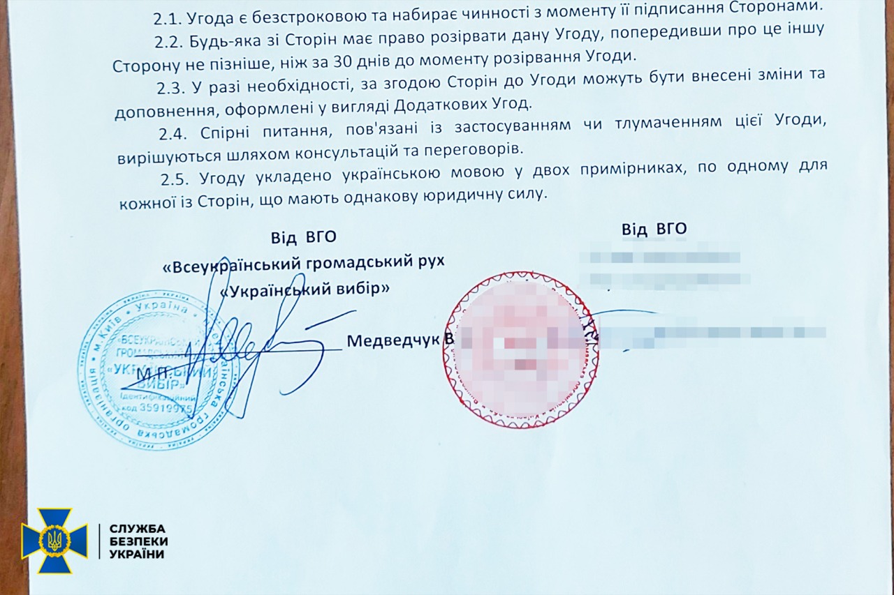 Встановлено, що зловмисники діяли, координуючись з росіянами та окремими членами ГО «Український вибір». Серед іншого у 2019 році вони мали зв’язок із приймальнею тодішнього помічника російського президента Владислава Суркова.