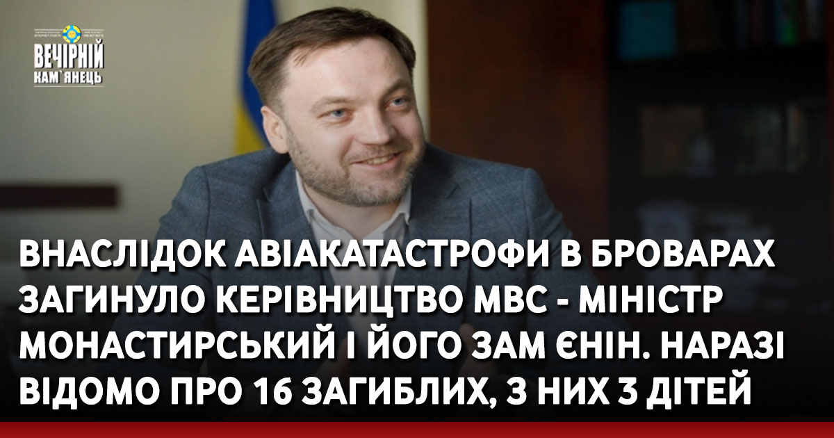 Сьогодні вранці, 18 січня, у Броварах розбився гвинтокрил ДСНС. Внаслідок авіакатастрофи загинуло керівництво МВС: міністр Денис Монастирський, перший заступник міністра Євген Єнін та державний секретар МВС Юрій Лубкович.