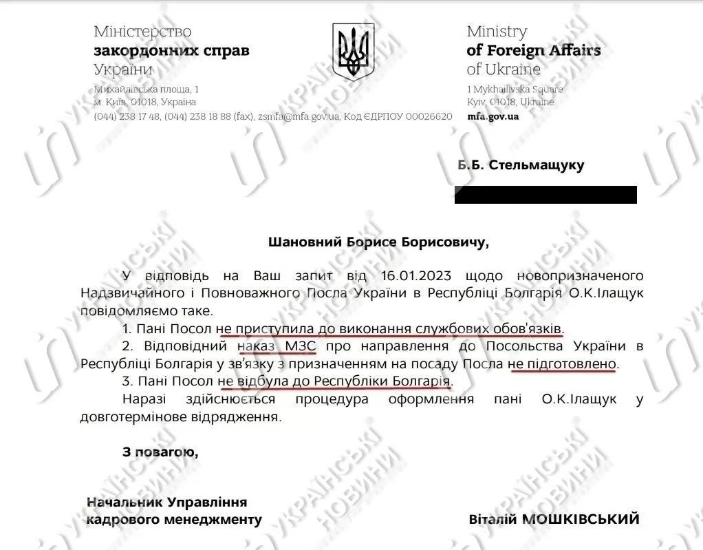 Міністерство закордонних справ (МЗС) України повідомило, що станом на 17 січня новопризначена надзвичайний і повноважний посол України в Болгарії Олеся Ілащук не приступила до виконання службових обов’язків та не відбула до Республіки Болгарія.