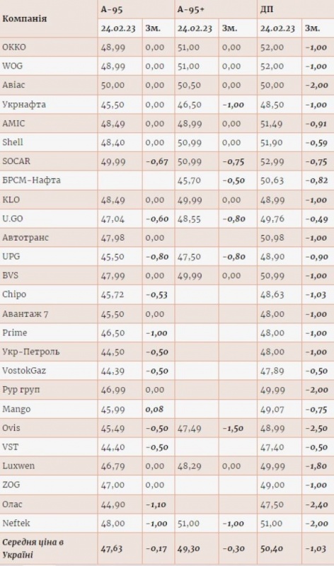 Українські АЗС упродовж тижня від 17 по 24 лютого знизили ціну на бензин в середньому на 17-30 коп./л (до 47,63-49,30 грн/л) та на дизельне пальне – на 1,03 грн/л (до 50,40 грн/л).