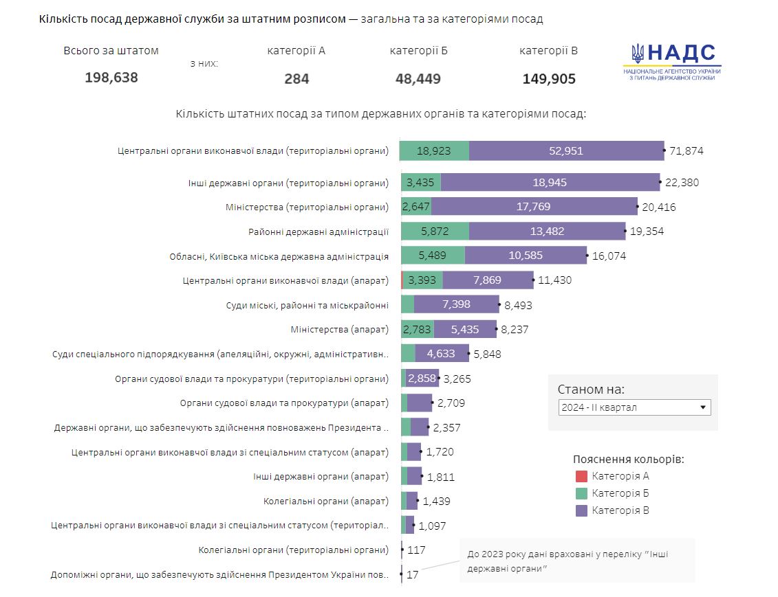 Відповідно до даних дашборду, на сьогодні в Україні налічують 198 638 посад державної служби за штатним розписом. Із них найвищої категорії А – 284. Водночас фактично працює 158 091 держслужбовець.