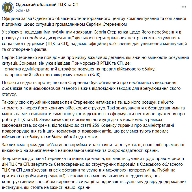 "У зв’язку з нещодавніми публічними заявами Сергія Стерненка щодо його перебування в розшуку та спробами дискредитації діяльності територіальних центрів комплектування та соціальної підтримки (ТЦК та СП), надаємо офіційне роз’яснення для уникнення маніпуляцій та спотворення фактів. Сергій Стерненко не повідомив про низку важливих деталей, які значно змінюють розуміння ситуації", - йдеться в повідомленні.