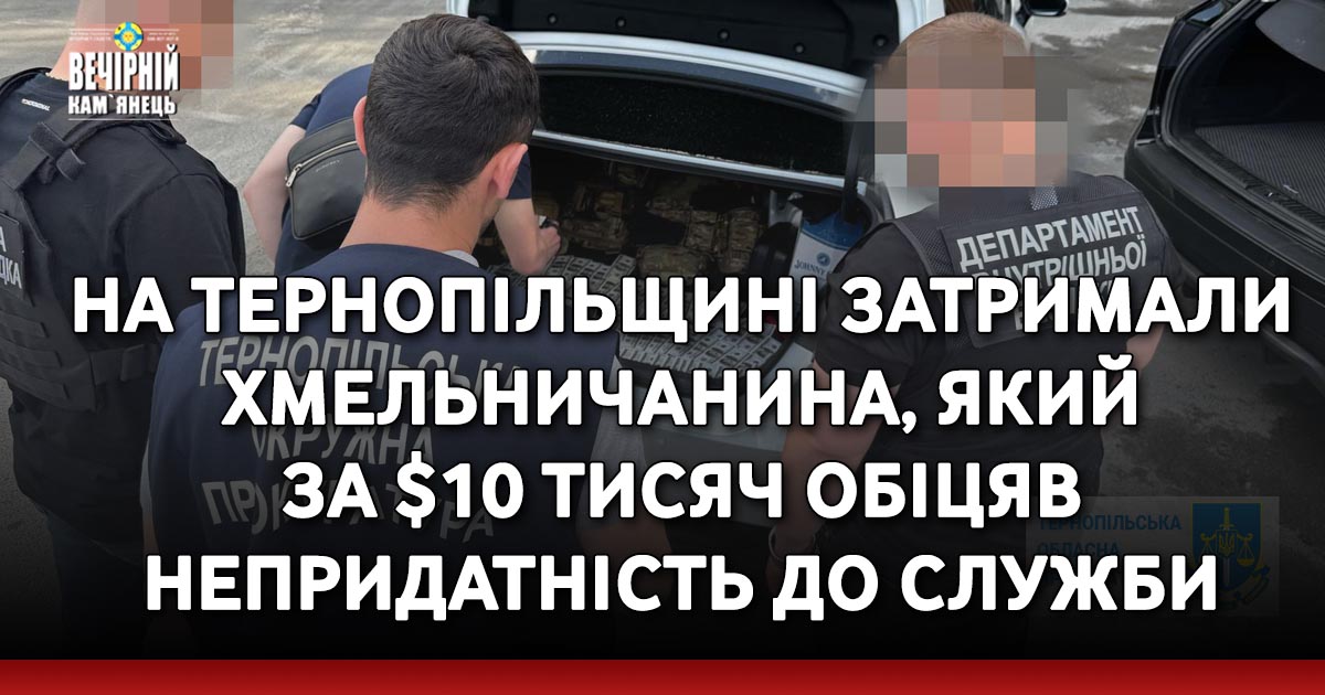 За даними слідства, 44–річний житель Хмельницького пообіцяв військовослужбовцеві з Тернополя використати знайомства серед посадовців ТЦК та СП й медичних закладів, щоб оформити йому документи про визнання непридатності до військової служби й виключення з військового обліку. Ця «послуга» коштувала 10 000 доларів США. При одержанні цієї суми на одній із заправних станцій Тернополя підозрюваного затримали правоохоронці. Вирішується питання про обрання йому запобіжного заходу у виді тримання під вартою.