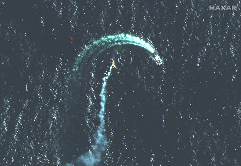Поруч із російським десантним кораблем класу «Серна», упізнаним Maxar, видно два стовпи диму. Судно, схоже, робить крутий поворот, коли ракета потрапляє у воду.