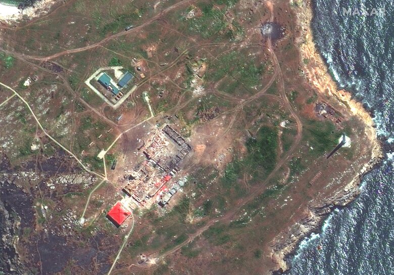 Супутникові знімки Maxar Technology показали, як Збройні сили України атакують ракетою російський корабель біля захопленого острова Зміїний.