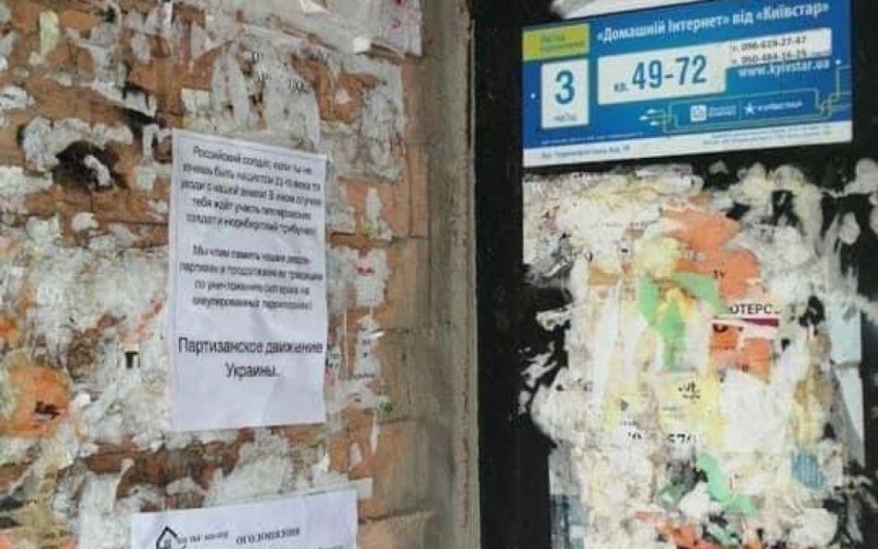 "Російський солдате, якщо ти не хочеш бути нацистом 21-го століття, то йди з нашої землі! В іншому разі на тебе чекає доля гітлерівських солдатів і Нюрнберзький трибунал! Ми шануємо пам’ять наших дідів-партизанів і продовжуємо їхні традиції по знищенню сил ворога на окупованих територіях! Партизанський рух України", – йдеться в тексті листівок.