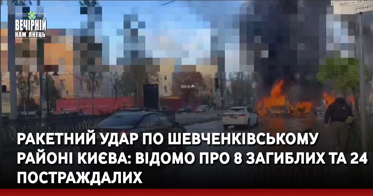 Як повідомив радник міністра внутрішніх справ України Ростислав Смірнов, у Шевченківському районі Києва внаслідок ракетного удару у понеділок загинули 8 людей, ще 24 мирні жителі отримали поранення.