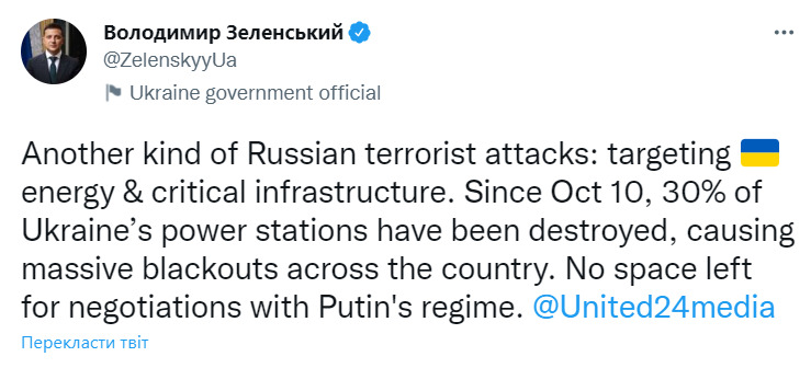 "Ще один вид російських терористичних атак: цільова енергетична та критична інфраструктура. Із 10 жовтня 30% українських електростанцій зруйновано, що спричинило масові відключення світла по всій країні. Для переговорів з режимом Путіна не лишилося місця", - зазначив глава держави.
