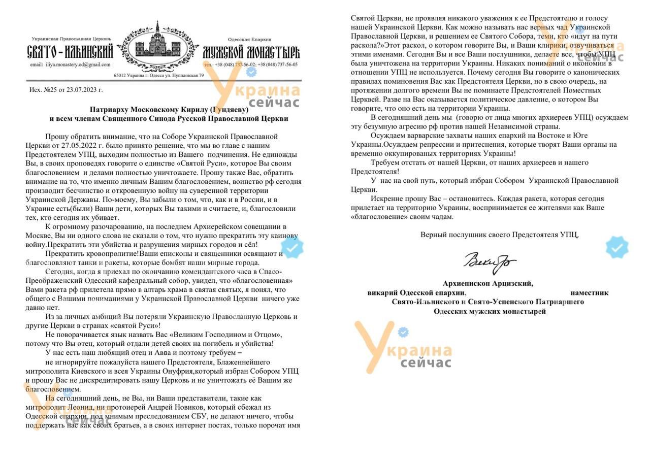 У тексті листа зазначається: "Припинити кровопролиття! Ваші єпископи та священики освячують та благословляють танки та ракети, які бомблять наші мирні міста. Сьогодні, коли я приїхав після закінчення комендантської години до Спасо-Преображенського Одеського кафедрального собору, побачив, що "благословенна" вами ракета РФ прилетіла прямо до вівтаря храму до святая святих, я зрозумів, що спільного з вашими розуміннями в Українській Православній Церкві нічого вже давно немає. Через особисті амбіції ви втратили Українську Православну Церкву та інші Церкви у країнах "святої Русі".