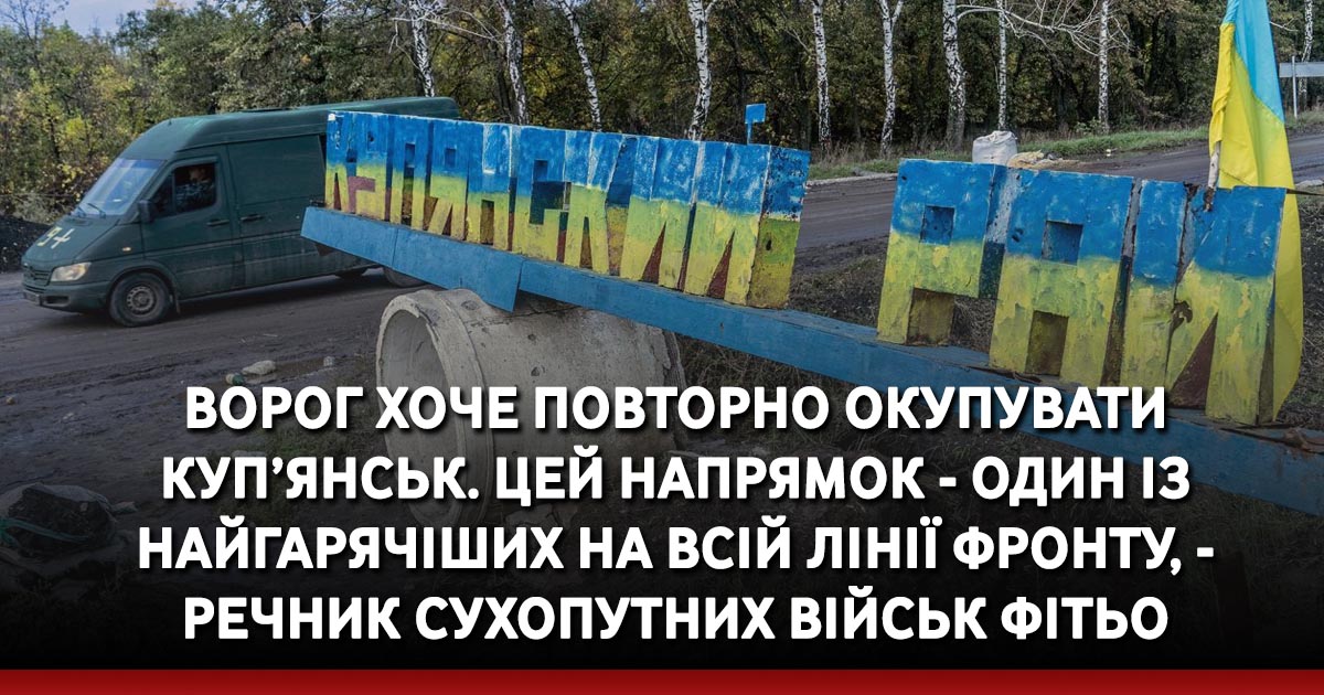 "Безумовно, бачимо, що цей напрямок - один із найгарячіших на всій лінії фронту. Ворог має на меті повторно окупувати Куп'янськ, це важливий логістичний центр, через який під час минулої окупації здійснювалося постачання провізії, боєприпасів", - сказав Фітьо на брифінгу в Media Center Ukraine - Ukrinform.