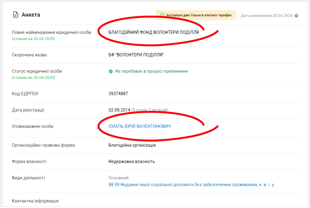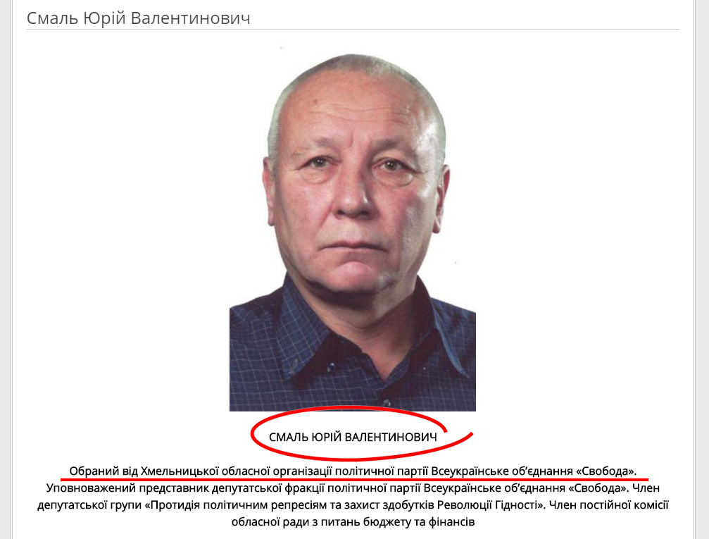 За інформацією, веб-портал YouControl керівником благодійного фонду "Волонтери Поділля" є Юрій Валентинович Смаль – депутат Хмельницької обласної ради від ВО "Свобода", соратник діючого мера міста Хмельницький Олександра Симчишина.