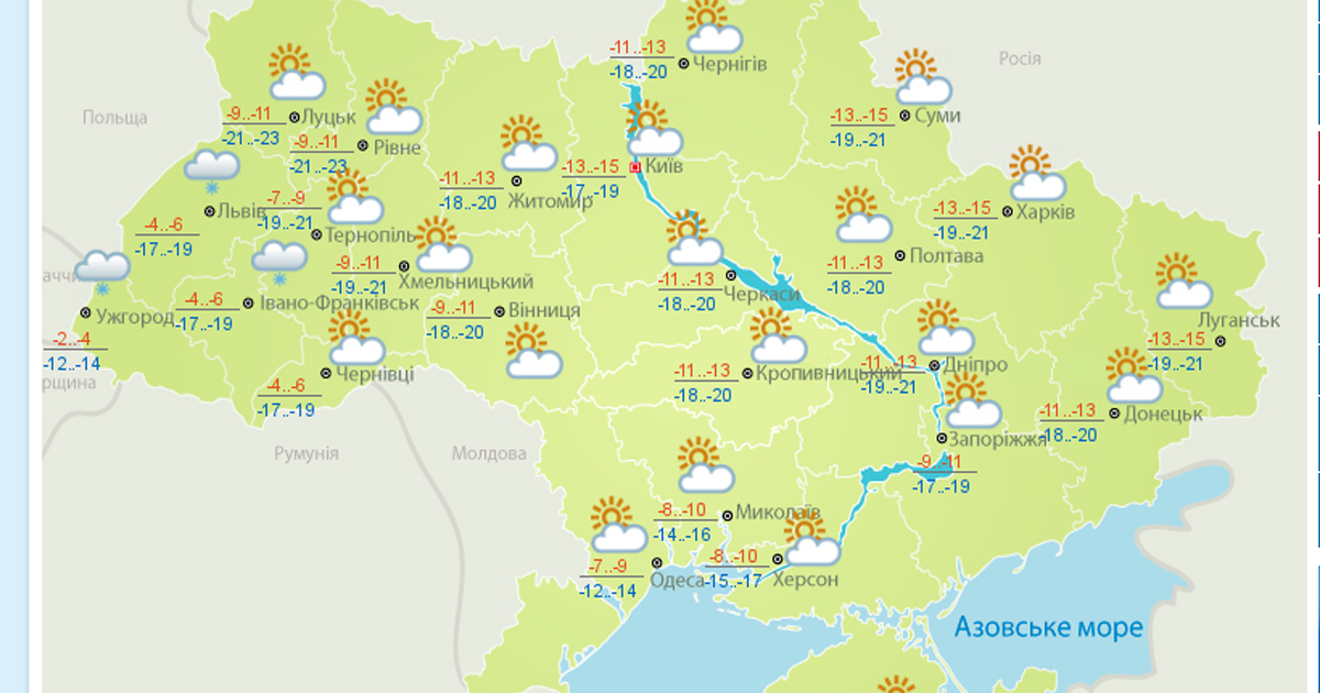 "Холодна без істотних опадів погода, лише у східних, Дніпропетровській та Запорізькій областях вночі сніг, хуртовини. Температура у більшості областей вночі 16-21°, місцями 22-25°, вдень 12-17° морозу; у південній частині, на Прикарпатті та Закарпатті вночі 11-16°, вдень 7-12° морозу. На дорогах України місцями ожеледиця. Вітер змінних напрямків, 3-8 м/с, на південному сході північно-східний, 7-12 м/с, вночі місцями пориви 15-20 м/с", - повідомляюь в Укркгідрометцентрі.
