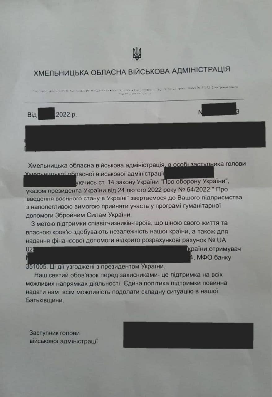 До обласної військової адміністрації надходять повідомлення від представників бізнесу Хмельниччини про те, що від імені керівництва адміністрації на їх адресу надсилаються електронні листи з вимогою долучитися до збору коштів на підтримку Збройних Сил України.