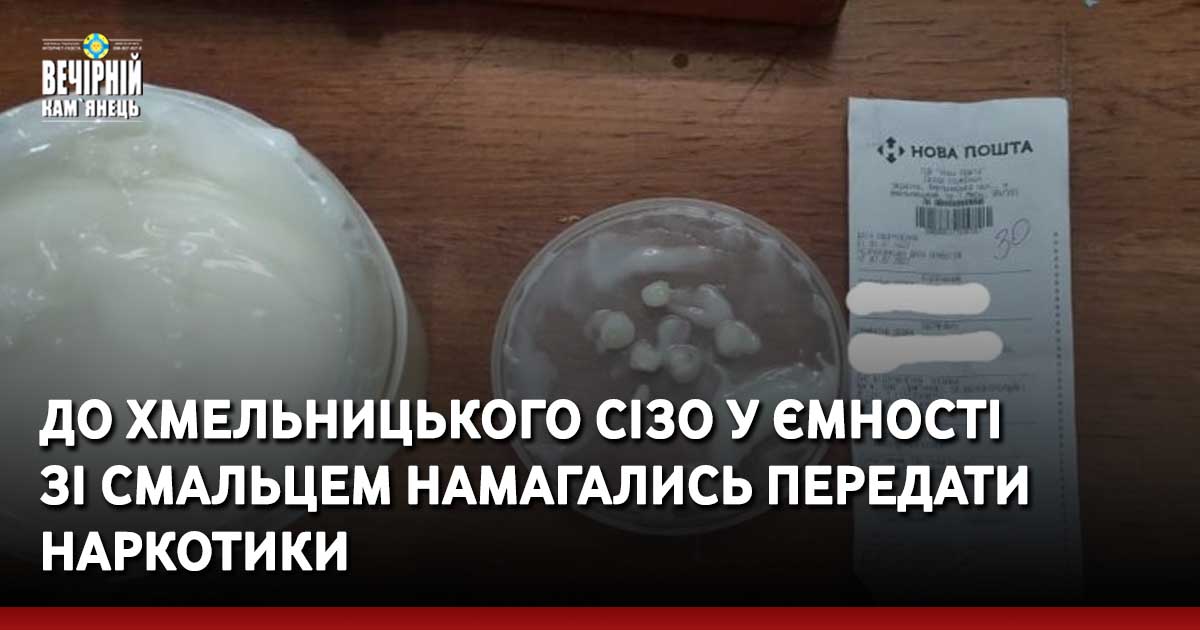 Так, під час догляду поштової посилки, що адресувалась громадянином Б. з міста Хмельницький на ім’я ув’язненого М., працівниками установи помічено в середині ємності із смальцем 6 згортків із речовиною невідомого походження зовні схожою на наркотичну.
