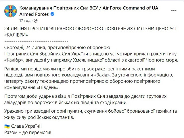 Зауважимо, що ця інформація не відповідає дійсності. Адже ще вчора, 24 липня, у командуванні Повітряних Сил Збройних Сил України заявили, що протиповітряною обороною Повітряних Сил Збройних Сил України знищено усі чотири крилаті ракети типу «Калібр», які були випущені у напрямку Хмельницької області з акваторії Чорного моря.