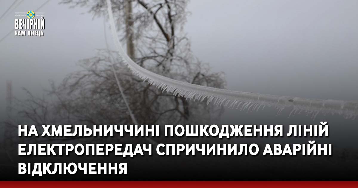 На значній частині Хмельниччини, вночі та під ранок, відбулись пошкодження повітряних ліній 10/0,4 кВ. Причинами пошкоджень є ожеледь на проводах, падіння гілок та дерев.
