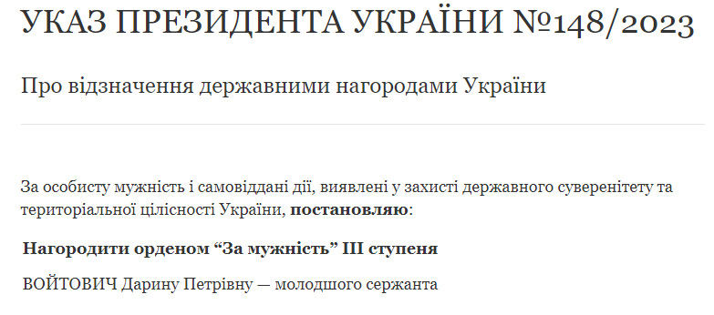 Молодшу сержантку з Хмельницького Дарину Войтович Президент України відзначив орденом “За мужність III ступеню”.