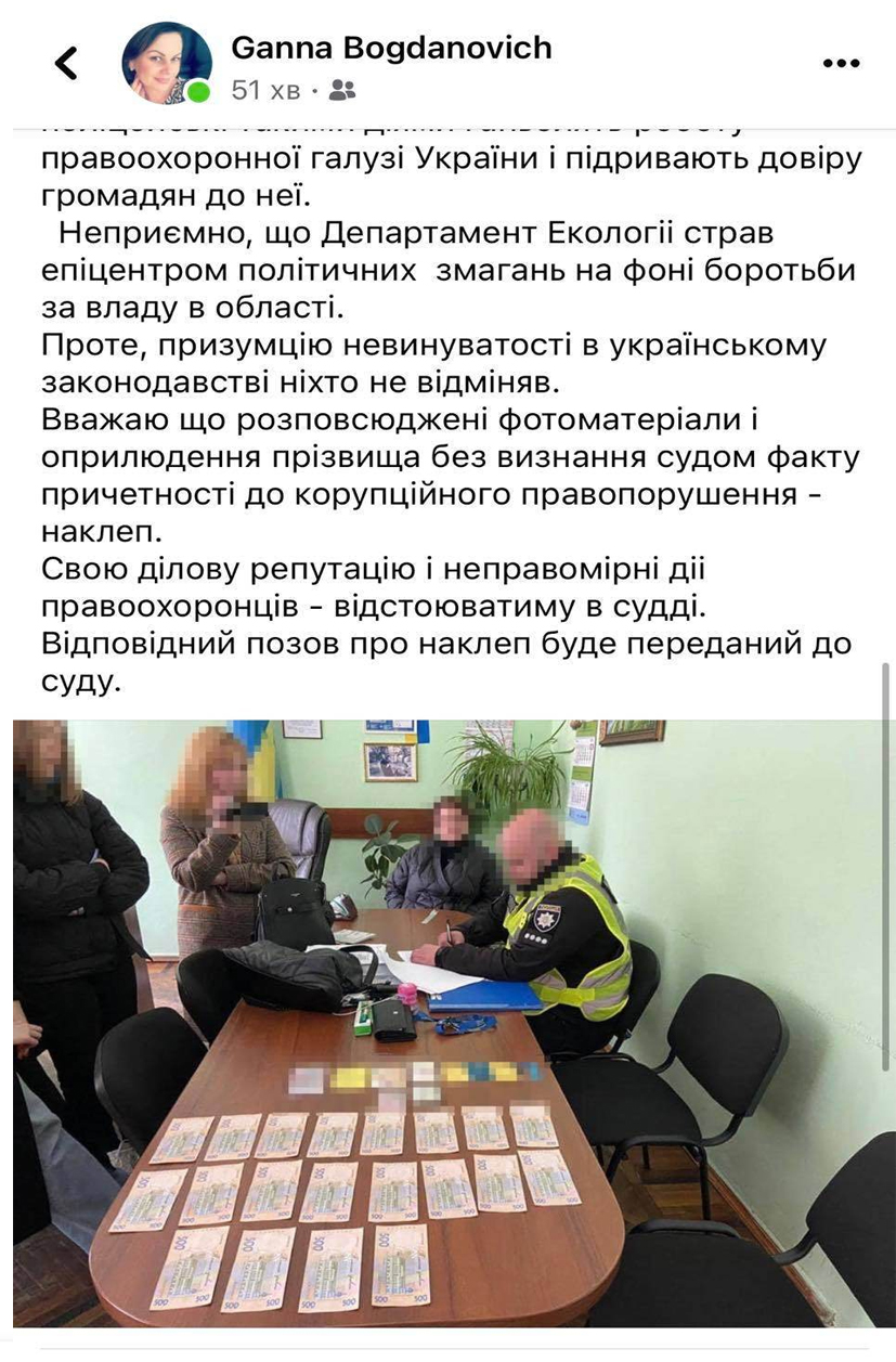 “Працівники поліції управління стратегічних розслідувань Нацполіції в Хмельницькій області нахабно увірвались в кабінет директора і почали шукати вигадану ними суму грошей, яка призначалась за якісь неправомірні дії. Ви б бачили їх радість, коли в моєму гаманці знайшли 10 тисяч гривень, які були частиною моєї офіційної зарплати та які я зняла в банкоматі за півгодини до цього дійства”, – йдеться у дописі посадовиці.