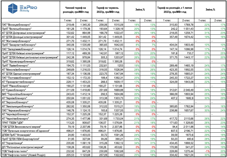 Зокрема, встановлено поетапне підвищення тарифів на розподіл на червень 2023р та на липень-грудень 2023р для «Вінницяобленерго», «Волиньобленерго», «ДТЕК Дніпровські електромережі», «Закарпаттяобленерго», «ДТЕК Київські електромережі», «ДТЕК Київські регіональні електромережі», «Львівобленерго», «Миколаївобленерго», «ДТЕК Одеські електромережі», «Полтаваобленерго», «Прикарпаттяобленерго», «Сумиобленерго», «Тернопільобленерго», «Харківобленерго», «Хмельницькобленерго», «Черкасиобленерго», «Чернігівобленерго», ПрАТ ПЕЕМ «ЦЕК» (за стимулюючим тарифоутворенням) та ДПЕМ ПрАТ «Атомсервіс», «ДТЕК ПЕМ-Енерговугілля», «Укрзалізниця», «Нафтогаз Тепло»