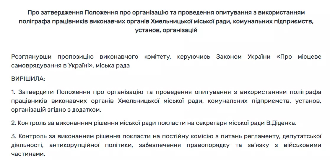 У ньому йдеться, що працівники виконкому, комунальних підприємств та установ міськради мають пройти перевірку на “детекторі брехні”. Відповідне положення про організацію та проведення опитування на поліграфі депутати міськради затвердили 15 вересня. Текст документу опублікували на сайті міської ради.